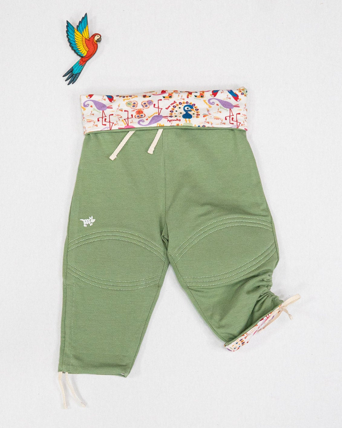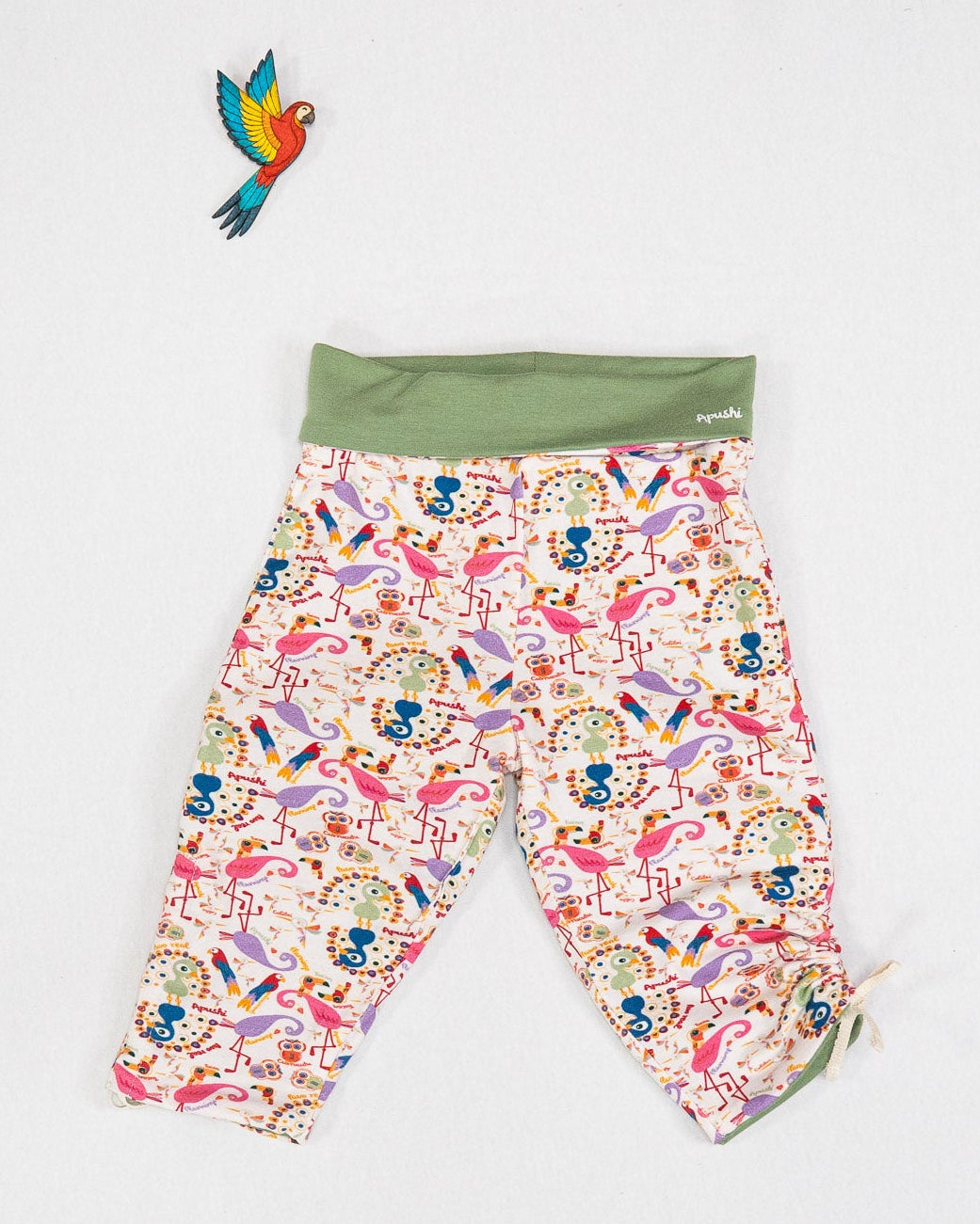 D'un côté, un vert eucalyptus, unisexe et facile à associer avec des bodys ou t-shirts. De l'autre, un motif délicat inspiré des oiseaux emblématiques de l'Amerique Latine, ajoutant une touche de nature et de culture à chaque tenue.